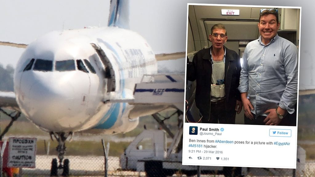 Terveys- ja turvallisuustarkastajana työskentelevä Innes matkusti taannoin EgyptAirin lennolla, jonka "pommivyöllä" varustautunut mies kaappasi. Innes halusi ikuistaa itsensä kaapparin kanssa.
