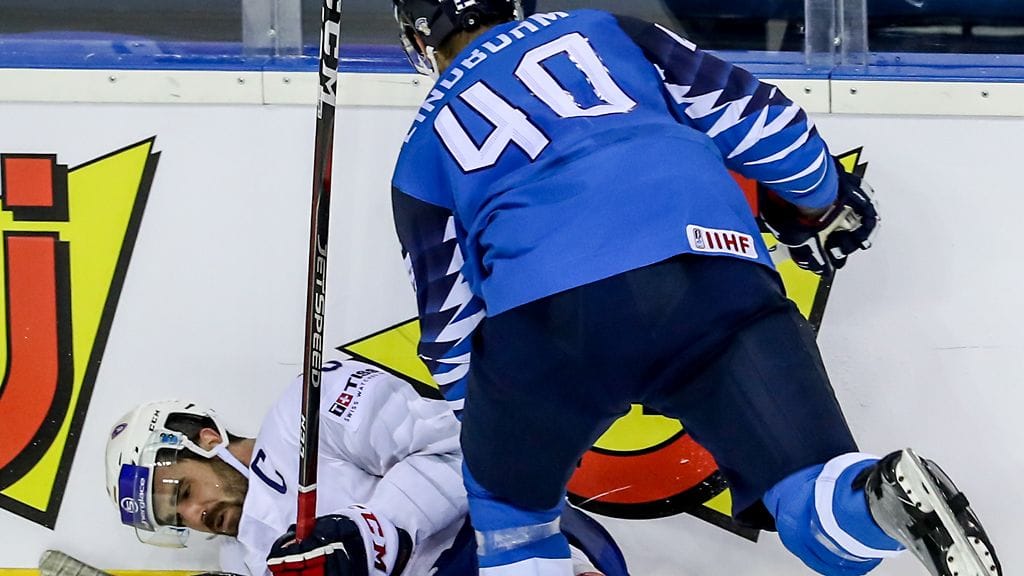 Puolustaja Petteri Lindbohm näytti taklaamisen mallia, kun Leijonat kaatoi Ranskan 3-0 jääkiekon MM-kisoissa sunnuntaina.