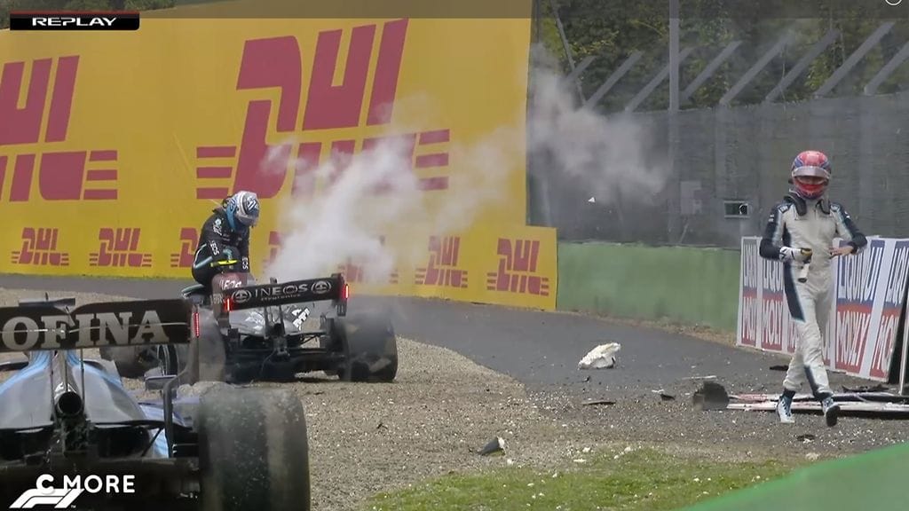 Vajaata kierrosta myöhemmin radan kakkosmutkassa rytisi. Mercedeksen Valtteri Bottas ja Russell lähestyivät Tamburello-shikaania ensin peräkkäin ja sitten rinta rinnan. Russellilla oli takasiipi auki, kun hänen oikean puolen eturenkaansa ajautui nurmikon puolelle ja brittikuski menetti autonsa hallinnan.