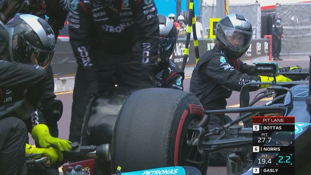 Bottaksen kisa päättyi Monacossa toiselta sijalta, kun Mercedes epäonnistui varikkokäynnillään. Auton oikean etupyörän kiinnitysmutteri ei auennut, ja mekaanikot lopettivat minuutin yrityksen jälkeen yrityksen.