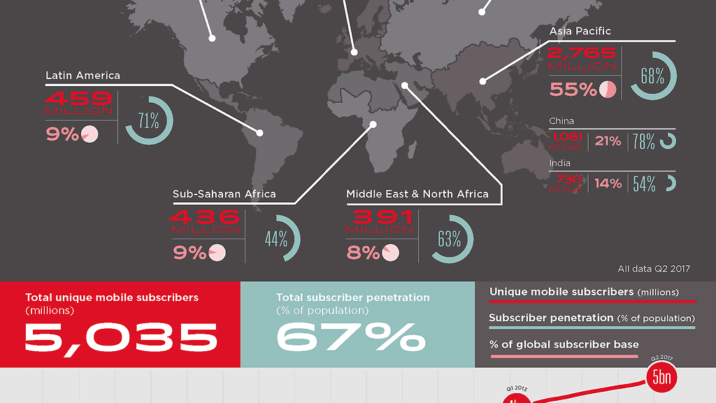 Maailmassa on nyt yli 5 miljardia ihmistä, joilla on matkapuhelinliittymä, kertoo operaattorien yhteistyöjärjestön GSMA:n tilasto. 5 miljardia matkapuhelinkäyttäjää edustavat jo 67 prosenttia koko maapallon väestöstä.