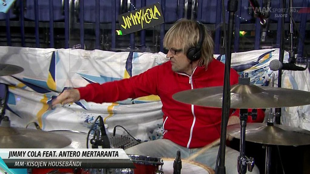 Rumpalina omassa Anza Mertaranta Allstars-yhtyeessä soittava selostajalegenda pääsi rumpusetin taakse myös torstaina ennen Suomi-Slovakia-puolivälierän alkua.