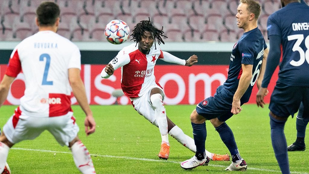 Slavia Prahan Peter Olayinka suti maalipaikassa Midtjyllandin vieraana palloon ensin olemattoman osuman, kunnes naulasi toisen yrittämänsä komeasti sisään. Slavia johtaa nyt jalkapallon Mestarien liigan viimeisen karsintakierroksen toista osaottelua ja koko otteluparia 1–0.