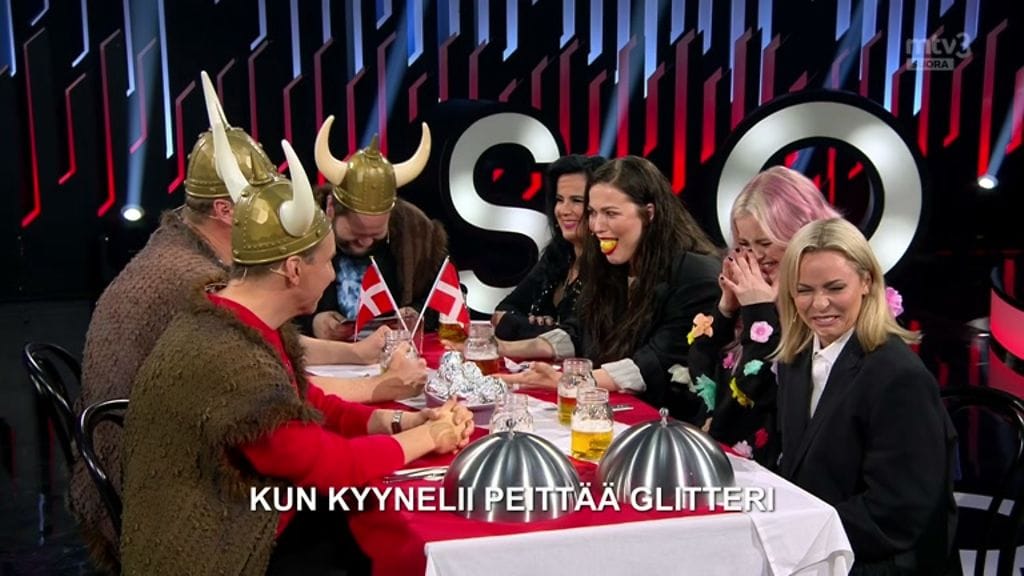 Heidät haastettiin hulvattomaan Puhutaan tanskaa -peliin, jossa perunat suussa Vesala ja Ellinoora arvuuttelivat parina ja Kaija Koo ja Vartiainen toisena parina omien kappaleidensa lyriikoita Possen juontajille Aku Hirviniemelle ja Jaakko Saariluomalle.
