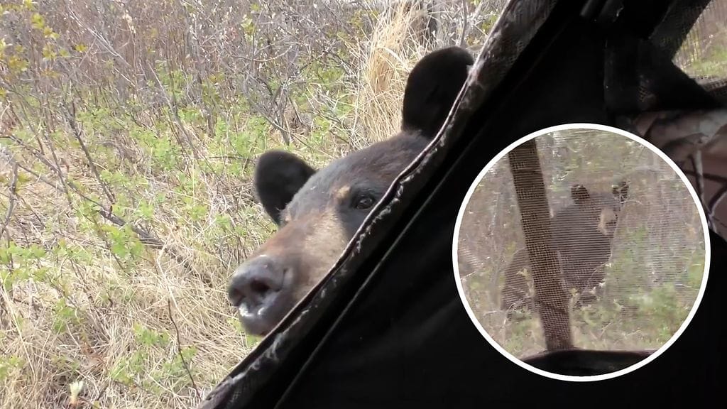 Saskatchewanissa Kanadassa metsästysteltassa ollut mies kuvasi pelottavan kohtaamisen karhun kanssa.