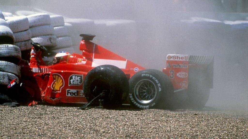 Schumi ajoi Britannian GP:n alussa rajusti ulos jarruvian takia. Hänen jalkansa murtui, mikä pakotti saksalaisen taipumaan mestaruustaistelusta ja nosti Mika Salon tilalle kuuden kisan ajaksi.