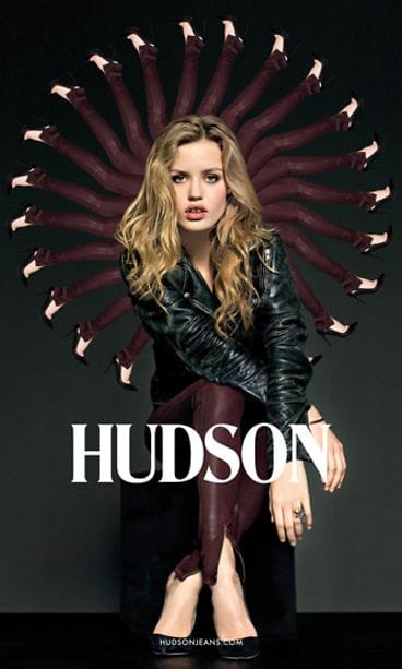 20-vuotias Georgia May Jagger poseeraa kabareetyylisessä farkkumainoksessa huulet mutrulla konkarimallin elkein. Myöskin naisen kuriositeetti, etuhampaita koristava väli, pääsee kuvissa esille.