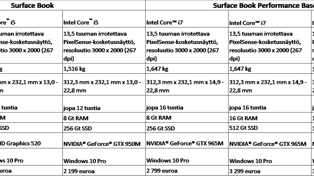 Surface Bookin lähtöhinta on 1 699 euroa. Myyntiin tulee myös Surface Bookin viime syksynä esitelty tehokkaampi Performance Base -versio. Malliston huippuversion hinta kohoaa 3 999 euroon.
