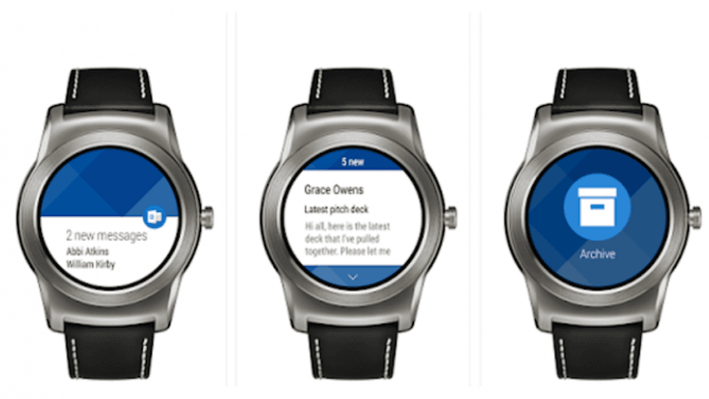 Android Wear -muodossaan Outlookilla voi luonnollisesti lukea sähköpostiviestejä suoraan älykellon ruudulta. Lisäksi viesteihin vastaaminen onnistuu joko valmiiden vastauspohjien tai sanelun avustuksella.