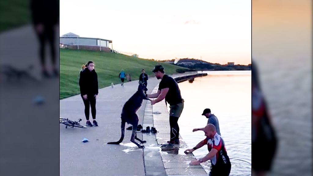Sitten miehet nostavat kengurun ja kantavat sen takaisin kuivalle maalle. Tässä kohtaa tilannetta oli pysähtynyt seuraamaan usea ohikulkija. Eräs lähellä seisonut mies nappasi kengurusta kiinni, kun väsynyt ja kylmettynyt eläin oli luhistua rantahietikolle.