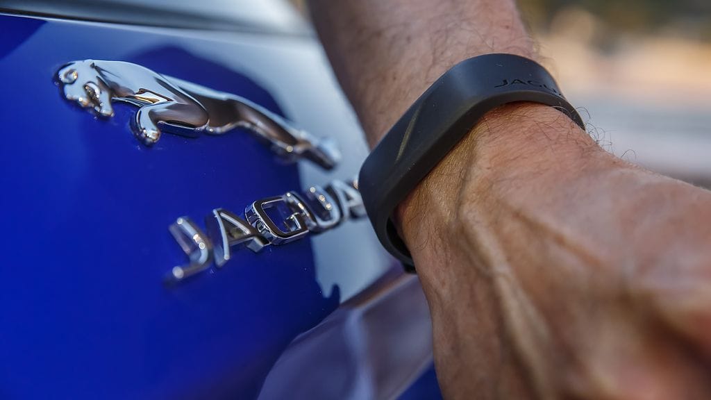 Ei hätää. Jaguarilla on ratkaisu ongelmaan. Se esitteli F-Pacessa vettä kestävän ja lisävarusteena myytävän aktiivisuusrannekkeen, joka toimii auton vara-avaimena. Se sietää vettä, ja ranteessa se on myös paremmin tallessa kuin vaikkapa shortsien vetoketjuttomassa taskussa. Ranteessa avain on myös hyvässä tallessa, jos autolla on tultu harrastamaan vähän raffimpaa ulkoilua – kuten raftingia, melontaa tai surffausta.
