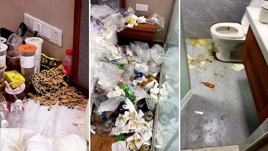 Mangshin kaupungissa lokakuussa kuvatulla videolla näkyy miehen huoneeseen jättämät noutoruokaroskat, muovipussit, tupakat ja muut jätteet ympäri huonetta.