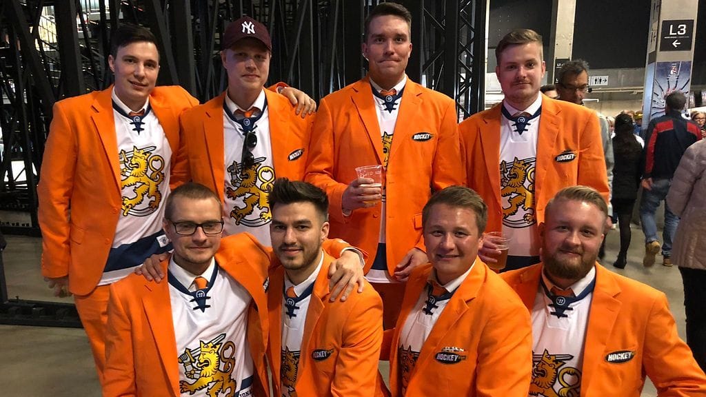 Kahdeksanhenkinen ystäväjoukko päätti vuosi sitten, että MM-reissulle pitää saada kunnon vetimet ylle. Oranssit puvut ja rintapieleen Hockey Nightin logo, ja asu oli valmis. Alle kolmikymppisten mieten ryhmä on kerännyt paljon huomiota MM-kisojen avausviikonloppuna.