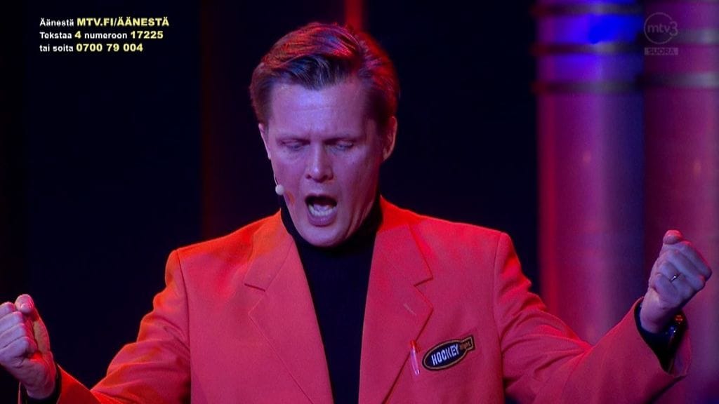 Putouksen suorassa lähetyksessä vieraillut Mika Saukkonen veti oranssin Hockey Night -takin ylle ja selosti sketsihahmon kilpailun.