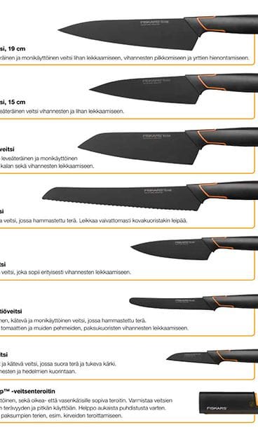 Fiskars Edge -sarjassa löytyy kokin veitset (19 cm ja 15 cm), Santoku-veitsi, leipäveitsi, Deba-veitsi, pieni keittiöveitsi ja juuresveitsi. Katso, mihin eri käyttötarkoituksiin veitset sopivat.