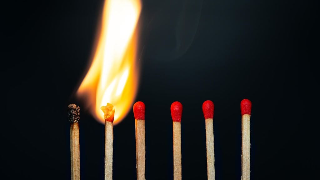 Animoidulla videolla seisoo tulitikkuja rinta rinnan. Osa tulitikuista on syttynyt palamaan. Tuli tarttuu tikusta toiseen ja leviää yhä edemmäs ja edemmäs. Sitten yksi tikuista astuu pois ringistä. Tulen leviäminen pysähtyy.