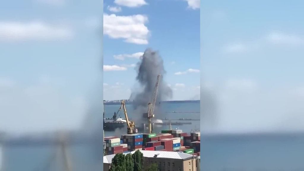 Silminnäkijä tallensi videolle venäläisen Kalibr-ohjuksen iskun viljasatamaan.