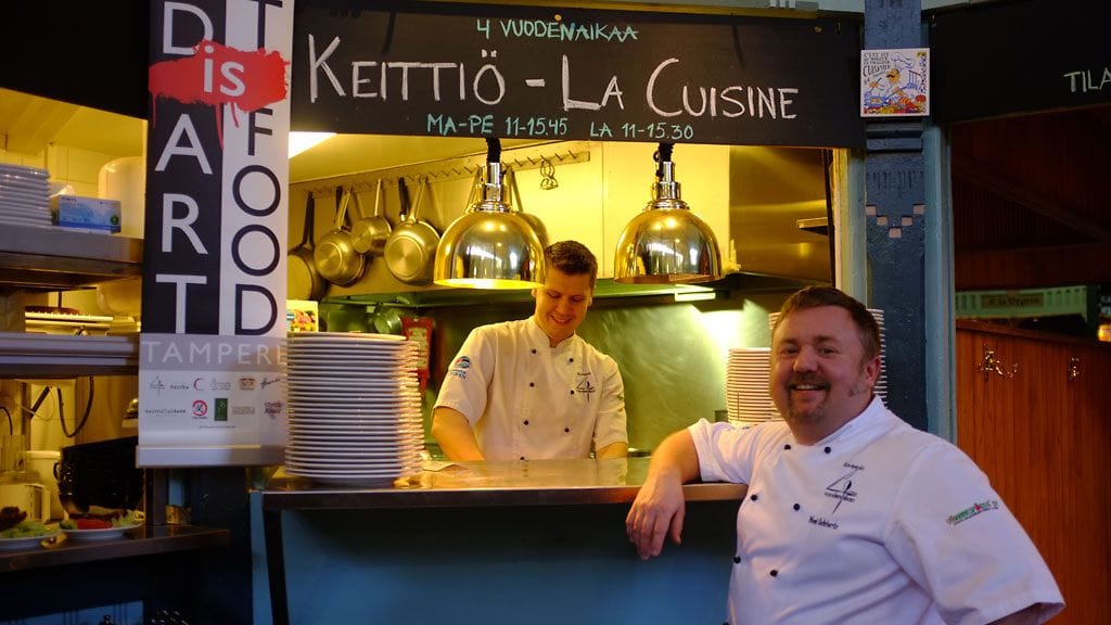 – Täydellinen ruoka syntyy siitä, että on puhtaat ja hyvät raaka-aineet. En ole tavannut sellaista kokkia, joka saisi huonoista raaka-aineista jotain hyvää aikaiseksi. Meillä on tässä Tampereen isoin kalatiski – helppohan siitä on rakentaa hyvää kalakeittoa, kertoo ranskalais-suomalainen ravintoloitsija
