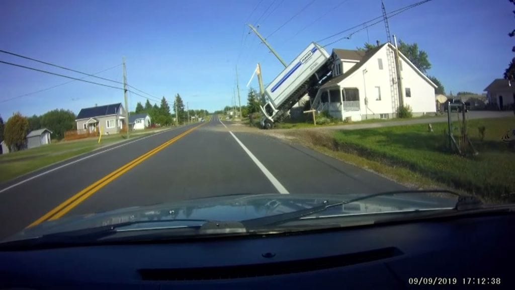 Kanadalaisautoilijan kojelautakamera tallensi merkillisen episodin. Kuorma-auto ajautui ulos tieltä, minkä jälkeen sen perä päätyi vieraisen talon katolle.