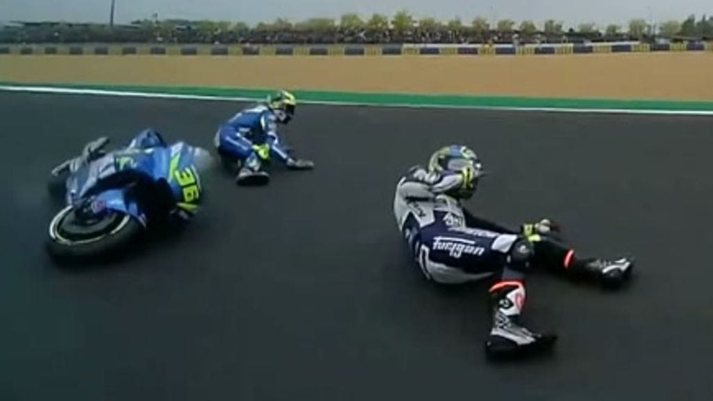 Ranskan MotoGP-kilpailu ei ehtinyt kunnolla edes käynnistyä ennen kuin ensimmäiset kuljettajat olivat kaatuneet.