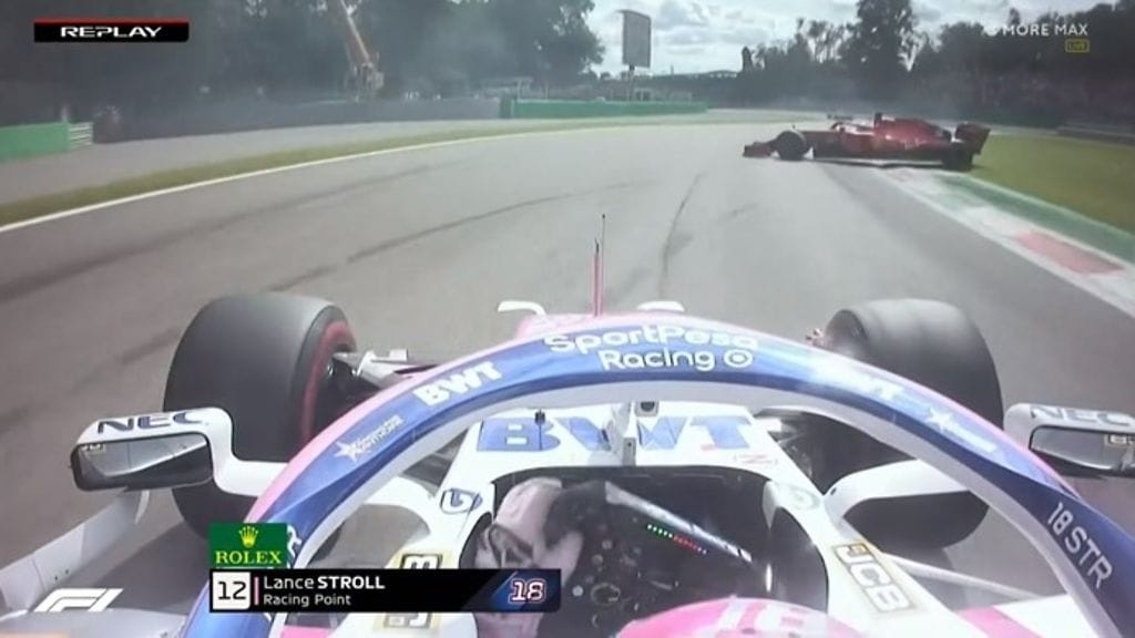 Vettel menetti kisan nelossijalla autonsa hallinnan Monzan radan Ascari-shikaanissa. Tämän jälkeen hän ei malttanut odottaa sopivaa paikkaa radalta, vaan palasi nurmikolta radalle suoraan Racing Pointin Lance Strollin eteen.
