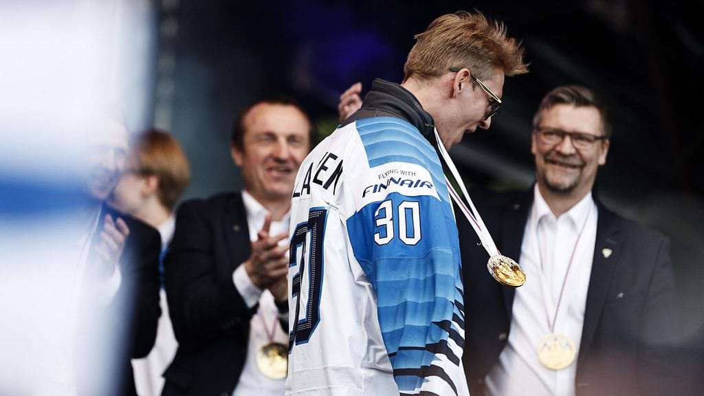 Leijonien kultamitaliin torjunut Kevin Lankinen osoitti uutta puoltaan kultajuhlissa Helsingin Kaisaniemessä.