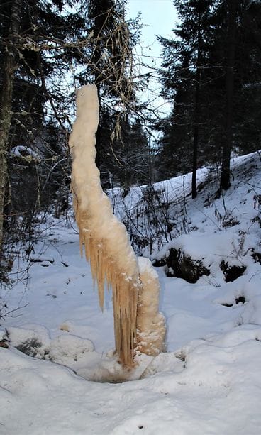 Karhunen löysi jäämuodostelman puron päältä. Jääkeko on todennäköisesti syntynyt puroa peittävässä jääkerroksessa olevasta reiästä. Aukosta pulppuava vesi vaahtoaa ja jäätyy.