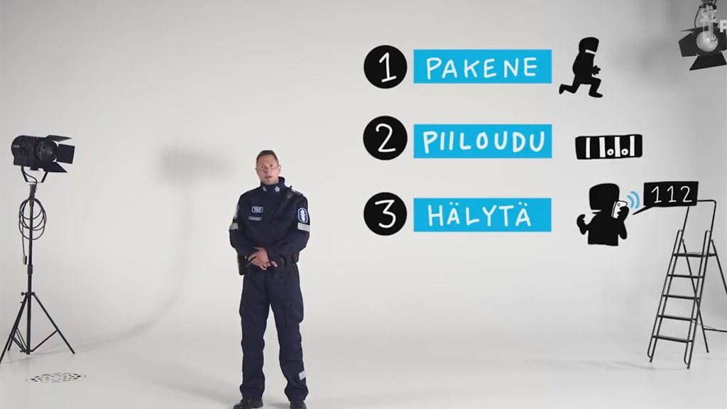 Vaarallisesta tilanteesta kannattaa paeta mahdollisimman nopeasti ja käskeä muut mukaan. Jos pakenemaan ei pääse, seuraava vaihtoehto on piiloutuminen, videolla neuvotaan. Apua tulisi hälyttää heti, kun ei ole välittömässä vaarassa.