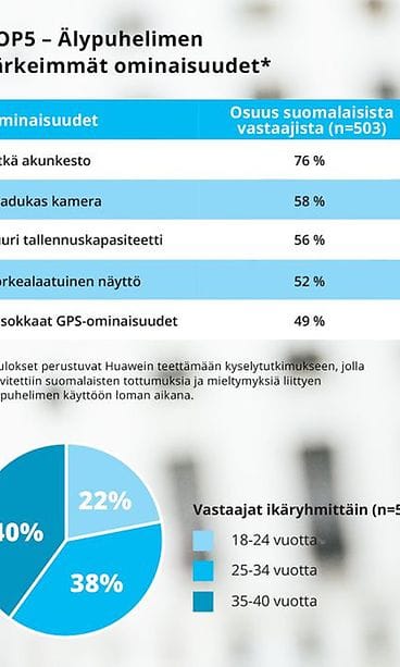 Huawei selvitti yhteiseurooppalaisella kyselytutkimuksella suomalaisten odotuksia älypuhelinten tärkeimmistä ominaisuuksista kesälomasesongin kynnyksellä. Jopa 76 prosenttia suomalaisvastaajista nimesi akunkeston keskeisimmäksi älypuhelimen käyttöön vaikuttavaksi ominaisuudeksi loman aikana ja joka viides koki älypuhelimen latauksen ylläpitämisen olevan aina vaikeaa loman aikana. Reilu kolmannes vastaajista kertoi käyttävänsä ulkoista virtalähdettä tai vara-akkua älypuhelimen lataamiseen.