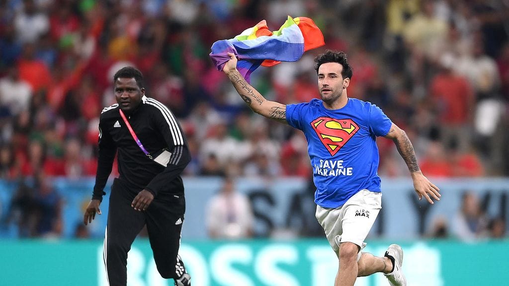 Italialainen Mario Ferri ryntäsi kentälle paidassa, jonka etuosassa luki "pelastakaa Ukraina" ja takapuolella "Kunnioitusta Iranin naisille". Hänellä oli myös mukanaan sateenkaari lippu. Hetken juoksentelun jälkeen Ferri saatiin kiinni ja turvallisuushenkilöstö kuljetti hänet pois kentältä.