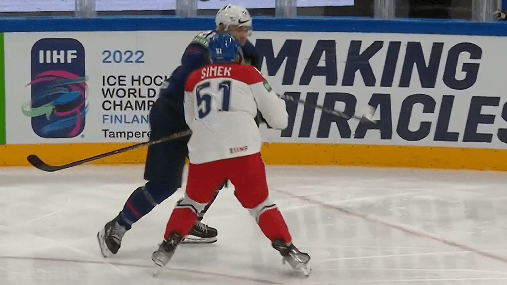 Tshekin ja USA:n välisessä huippuottelussa nähtiin raju taklaus, kun USA:n Kieffer Bellows jyräsi Tshekin Radek Simekin.