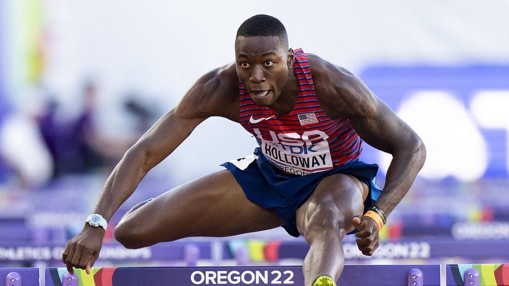 Yhdysvaltain Grant Holloway uusi miesten 110 metrin aitajuoksun maailmanmestaruutensa Eugenen loppukilpailussa, jota voi hyvin kuvata kaoottiseksi. Etusuoraa aitoi lopulta maaliin asti vain viisi miestä.