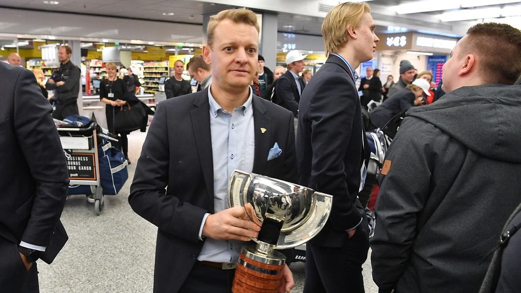 Nuorten Leijonien GM Kimmo Oikarinen oli saanut lentokentällä tehtäväkseen pidellä pokaalia, joka oli ottanut hieman osumaa kultajuhlien yhteydessä. Oikarinen esitteli komeaa pystiä MTV Urheilulle.
