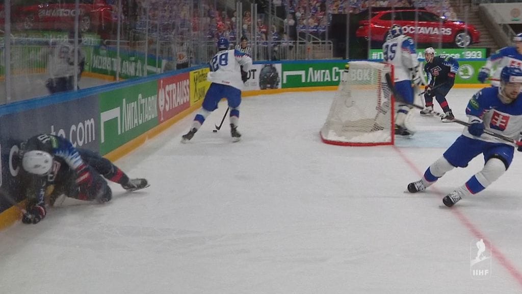 USA menetti ensin Matt Royn, joka sai ilmeisesti olkapäähänsä kovan iskun ottaessaan slovakkipelaajan taklausta vastaan.