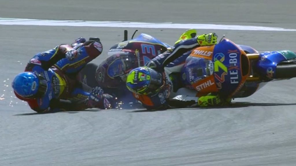 Binderin tallikaveri Jorge Martin teki upeaa nousua kärkiporukkaan, kunnes osui Sam Lowesiin, jonka seurauksena Lowes joutui keskeyttämään. Turhautunut brittikuljettaja näytti matkaa jatkaneelle Martinille keskisormea.