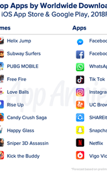 Vuoden 2018 aikana sovelluksia ladattiin yhteensä 113 miljardia kertaa ja rahaa niihin käytettiin yli 65 miljardia euroa. Latausmäärät kasvoivat kymmenellä prosentilla edellisvuoteen nähden kulutuksen noustessa peräti 20 prosenttia. Katsauksessa on huomioitu sekä Applen App Store että Googlen Play -kauppa, joiden lataukset on laskettu yhteen. Katsaus huomioi lataukset tammikuun alusta 15. joulukuuta asti.