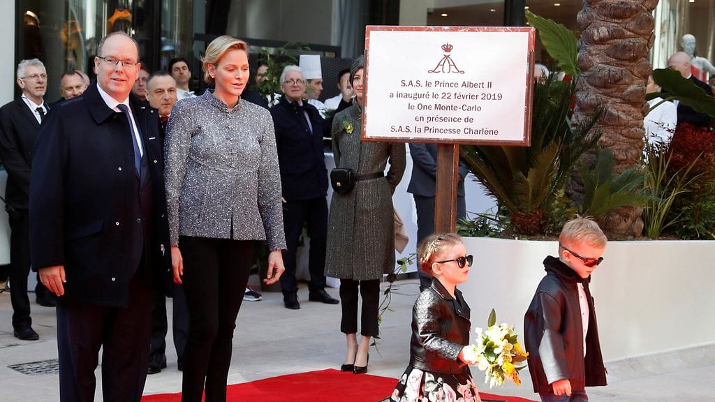 Monacon ruhtinas Albert ja ruhtinatar Charlene lapsineen näyttäytyivät ostoskeskuksen avajaisissa.