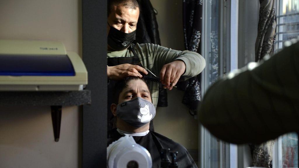 On kuin juhlapäivä: brysseliläinen parturi Oueslati Kamel tarjoaa asiakkailleen kahvia, croissanteja ja donitseja. Belgian parturi- ja kampaamoliikkeet saivat tänään avata ovensa asiakkaille ensimmäistä kertaa kuukausien tauon jälkeen.