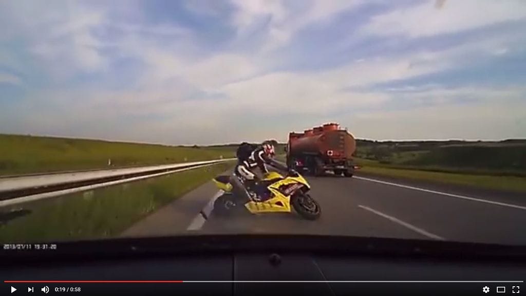 Prätkäjätkä nimittäin ohittaa auton, ajaa tämän eteen ja aivan yllättäen vetää liinat kiinni. Lopputulosta ei ole vaikea arvata. Autoilijan oikeusturvan vuoksi tapaus onneksi tallentui auton kojelautakameraan.