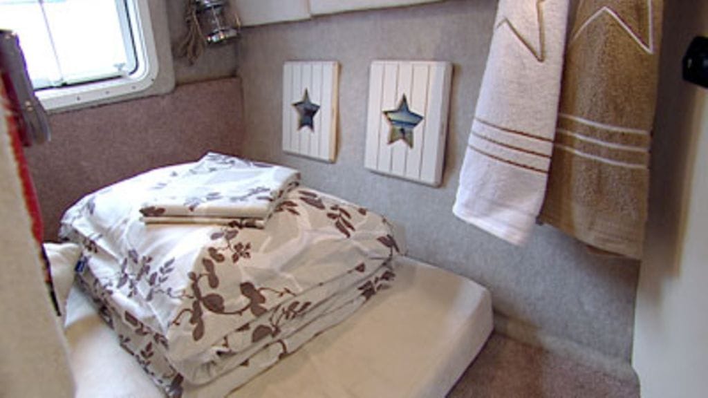 Samalla vaalealla kankaalla päällystettiin myös minihytin patja sekä aikaisemmin marjapuuron väriset veneen saumakohdan peittävät listat, jotka nyt tuovat myös kaivattua tilan tuntua. Sohvien reunaan taas valittiin erityinen tere, joka on tarkoitettu käytettäväksi ulkotiloissa tai kosteissa olosuhteissa.