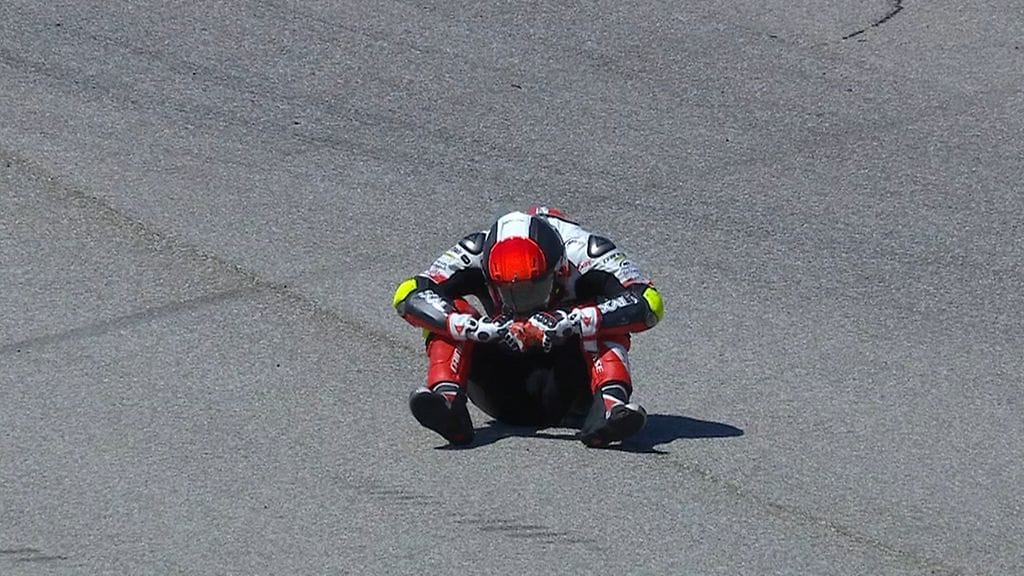 Dramaattisin kaatuminen sattui vain viisi kierrosta ennen maalia, kun kisaa pitkään johtanut Tatsuki Suzuki kaatui kärkipaikalta. Aggressiivisesti kisan aloittanut japanilainen lipsautti omia aikojaan radalta ulos mutkassa seitsemän. Voitto olisi ollut Suzukille uran ensimmäinen.