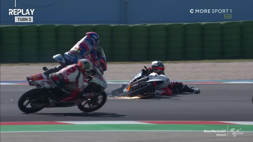 Ratamoottoripyöräilyn MM-sarjan Moto3-luokan mestaruustaisto tiivistyi sunnuntaina, kun kautta dominioinut espanjalainen Albert Arenas kaatui ja jäi pisteittä San Marinon osakilpailussa.