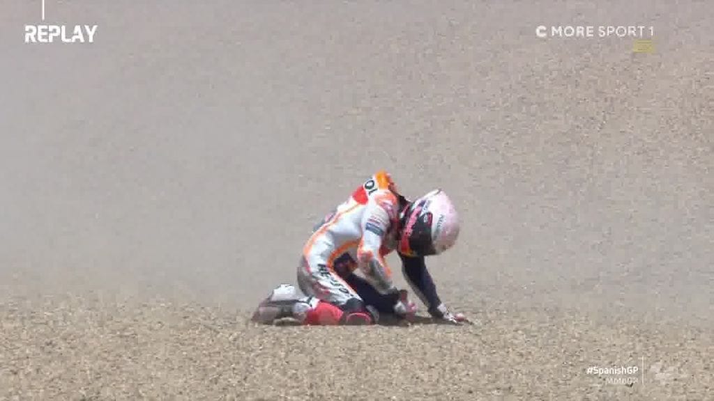 Kolmannesta ruudusta startannut Marquez nousi alkukierroksilla kisan kärkeen, mutta joutui altavastaajaksi, kun hän viidennellä kierroksella horjahti hiekoille. Kuusinkertainen maailmanmestari Marquez sai tässä vaiheessa pidettyä pyöränsä pystyssä, mutta putosi 16. sijalle. Virheensä jälkeen Marquez aloitti hurjan kirin kohti kärkeä. Hän nousi jo kolmannelle sijalle, mutta menetti uudelleen mutkassa pyöränsä hallinnan. Toista kertaa Marquez ei pystynyt tilannetta pelastamaan ja hän kaatui rajusti. Rytäkän jälkeen Marquez piteli rannettaan, ja hänet kannettiin paareilla pois radalta.