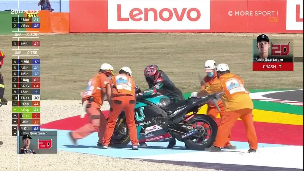 Kauden kaksi ensimmäistä kisaa voittanut Quartararo kaatui kisan alkukierroksilla. Hän pääsi jatkamaan ajamista, mutta joutui auttamatta letkan hännille. Hetkeä myöhemmin Quartararo keskeytti kisan.
