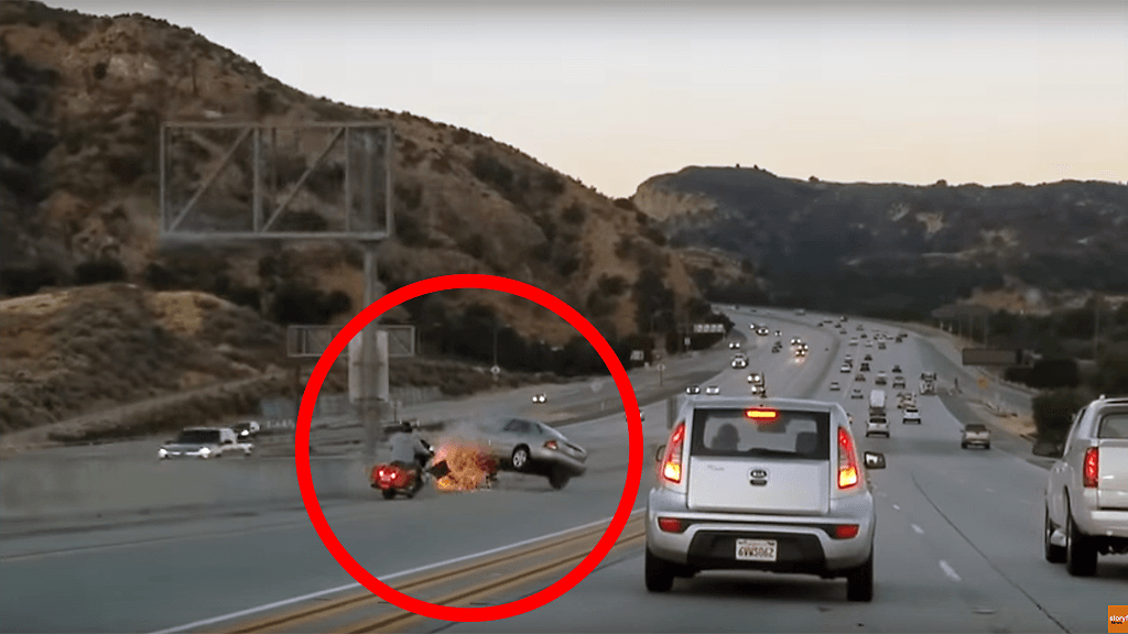 Silminnäkijän videolla näkyy, kuinka moottoripyöräilijä potkaisee henkilöautoa ja tulee käynnistäneeksi hurjan tapahtumasarjan. Henkilöauton kuljettaja vastaa potkuun kääntämällä ajoneuvonsa päin moottoripyörää. Henkilöauto rysäyttää päin keskikaidetta ja siitä edelleen kaistojen yli päin lava-autoa, joka sinkoutuu törmäyksen voimasta katolleen.