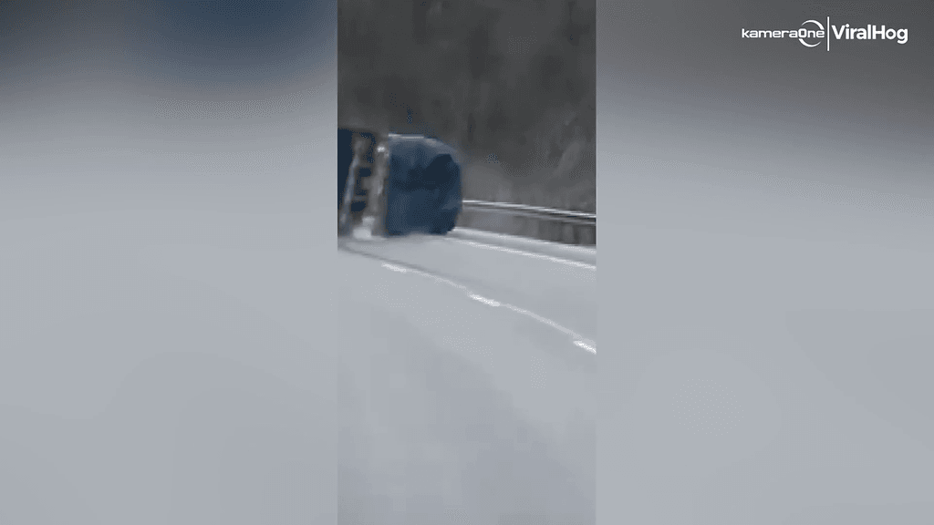 Videolta on nähtävissä, kuinka kyljelleen keikahtanut rekka-auto törmää kaiteeseen ja liukuu tietä pitkin useita metrejä. Ajoneuvo alkaa tilanteen jälkeen savuamaan rajusti.