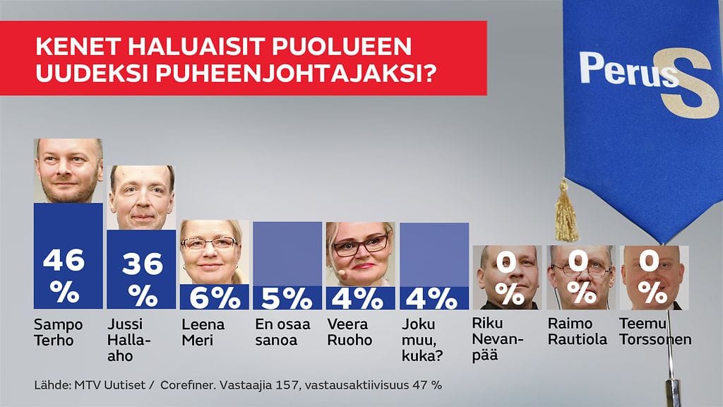 Perussuomalaisten piirihallitusten jäseniltä kysyttiin touko-kesäkuun vaihteessa, kuka on heidän suosikkinsa puolueen uudeksi puheenjohtajaksi. Eurooppa- ja kulttuuriministeri Sampo Terho on edelleen piiripäättäjien ykkössuosikki, sillä hän keräsi kyselyssä 46 prosentin kannatuksen. Halla-ahoa kannattaa 36 prosenttia vastaajista.