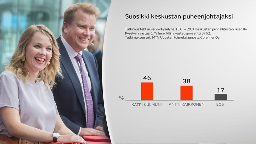 Elinkeinoministeri Katri Kulmuni on keskustan piiripäättäjien suosikki puolueen seuraavaksi puheenjohtajaksi MTV Uutisten teettämässä kyselyssä piirihallitusten jäsenille. Kulmunia keskustan johtoon kannattaa lähes puolet eli 46 prosenttia vastaajista. Puolustusministeri Antti Kaikkonen saa 38 prosentin kannatuksen. Piiripäättäjistä 17 prosenttia ei osaa sanoa kantaansa.