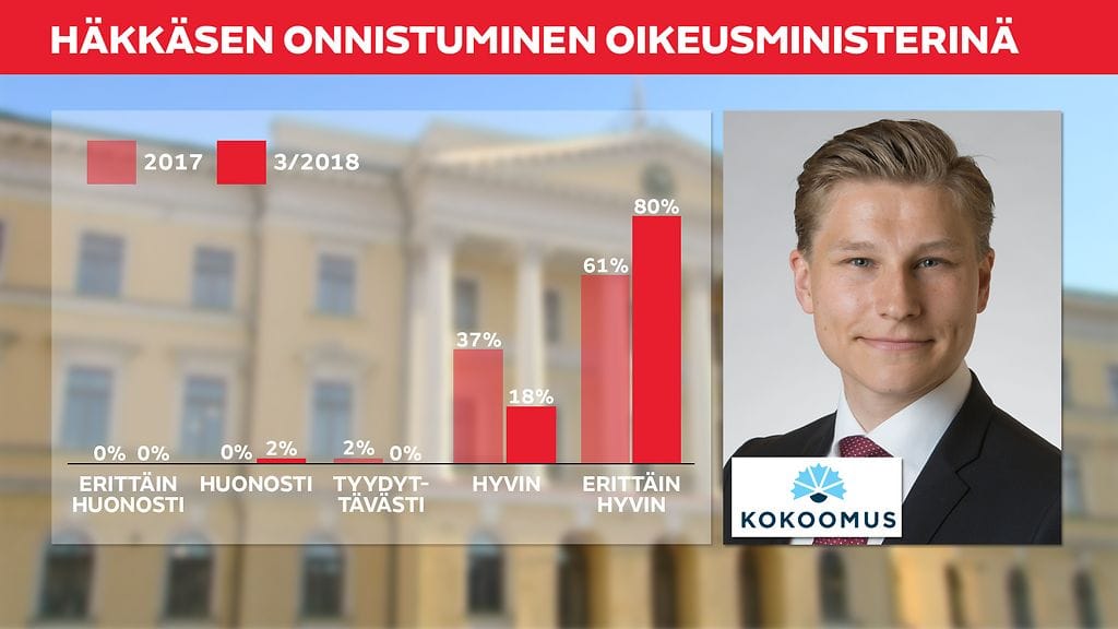 80 prosenttia kokoomuksen piiripäättäjistä on sitä mieltä, että Antti Häkkänen on onnistunut oikeusministerinä erittäin hyvin. Joulukuun kyselyssä vastaava prosentti oli 61.