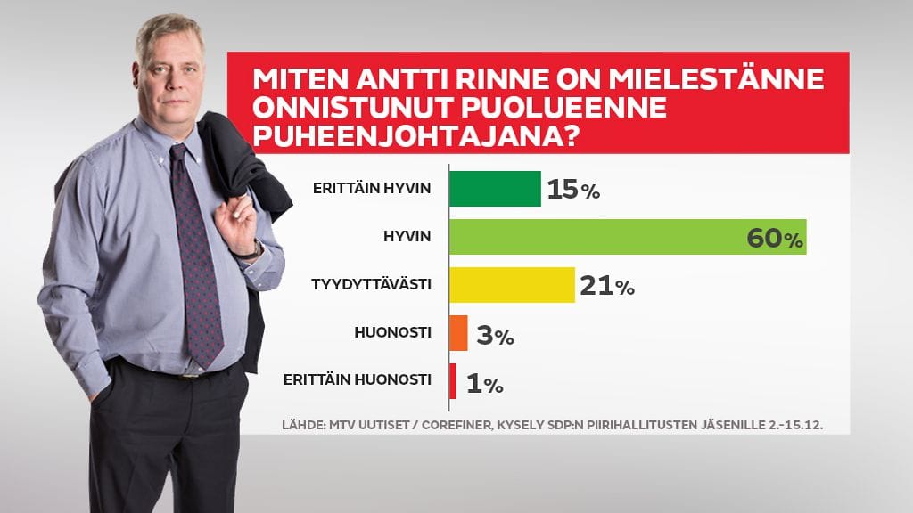 Kyselyssä SDP:n piirihallitusten jäsenille 75 prosenttia katsoo Rinteen onnistuneen puheenjohtajana hyvin tai erittäin hyvin.